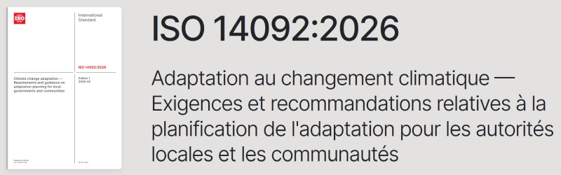 Le 9 février 2026, l'ISO publié la norme ISO 14092:2026 — Adaptation au changement climatique — Exigences et directives sur la planification de l’adaptation pour les gouvernements locaux et les communautés.